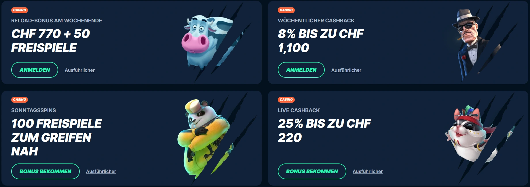 Wöchentliche Reload-Aktionen sorgen für konstante Spannung im Spielalltag. Jeden Freitag winken 50% Bonus bis maximal 770 CHF sowie zusätzliche 50 Freispiele. Diese Regelmässigkeit fehlt bei vielen anderen Anbietern. Dazu kommt ein strukturiertes Cashback-System mit 8% Rückerstattung auf Casino-Verluste bis zu 1100 CHF. Besonders für Live-Casino-Enthusiasten bietet das 25% Live-Cashback bis zu 220 CHF einen echten Mehrwert.